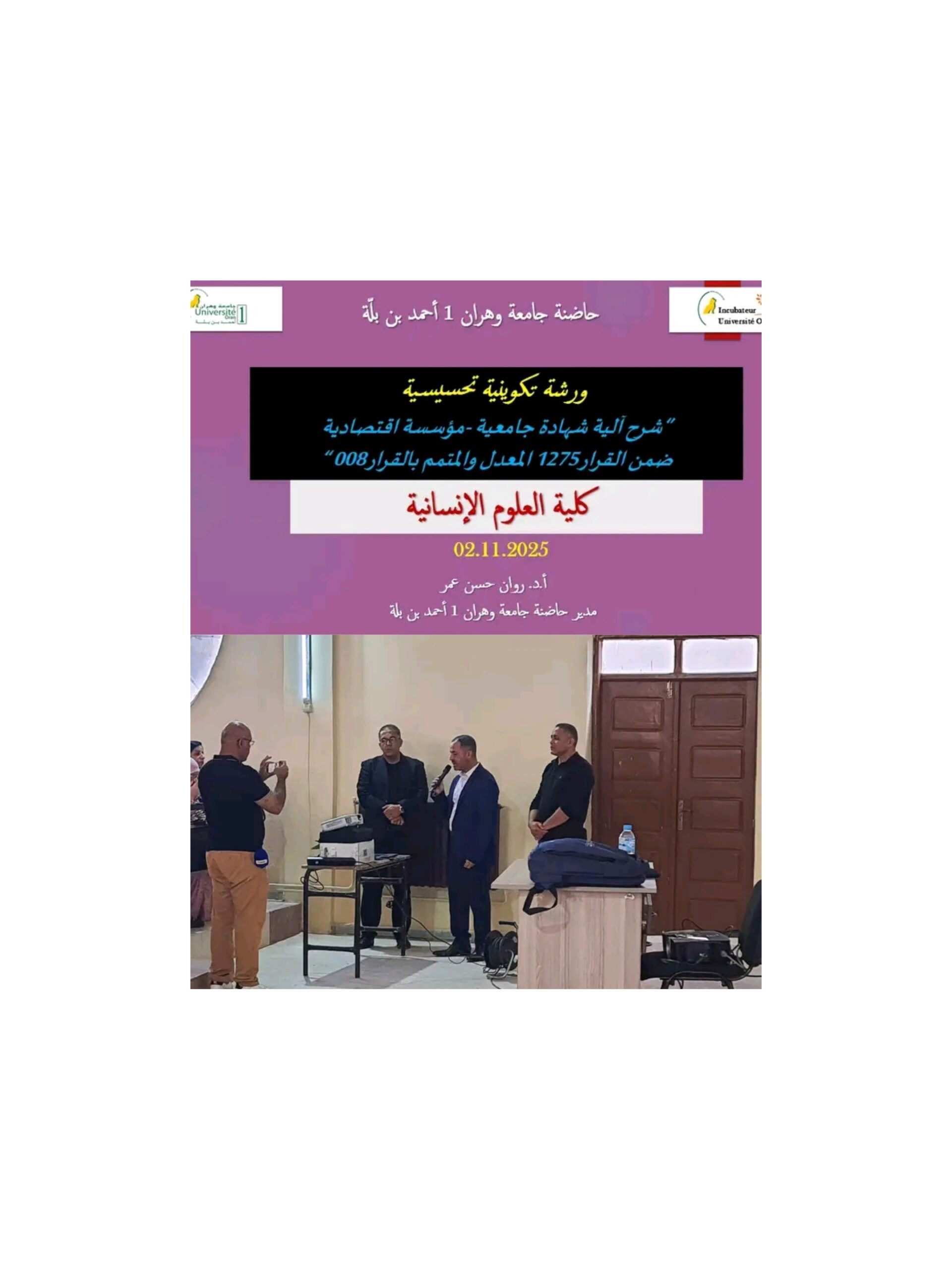 في إطار سعيها المتواصل لربط التكوين الجامعي بعالم المؤسسات الاقتصادية، نظّمت حاضنة جامعة وهران 1 يوم الإثنين 2 نوفمبر 2025 جلسة تحسيسية حول آلية “شهادة جامعية – مؤسسة اقتصادية”، وذلك على مستوى كلية العلوم الإنسانية، بحضور عدد معتبر من الطلبة والأساتذة المؤطرين.